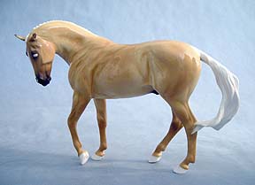First, is a “War Chant” Mustang sculpture by Kathi Bogucki, cast in bone china by Horsing Around. I’m glazing this piece to a sooty dappled buckskin. This photo below shows several firings of the golden buckskin undertones, plus the first airbrushed application of black.