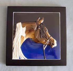 It is the first time I’ve painted one of my tiles with a dark background. The others have all been left with the natural white porcelain as the background. The nice thing about a colored or dark background is that I can leave white markings on the head and mane/forelock. With a light background, there’s nothing to define the edges of the whites. I loved this look so much that it is now displayed on my studio wall. I plan to do a series of these gradient-background tiles; I have a whole palette of colors to use as the accent color!