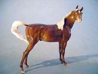 Last, is a sculpture by artist Brigitte Eberl, cast in bone china by Horsing Around, that I am glazing for a client to a dark chocolate-y sorrel. This is the first layer of gold color which I want to show through the darker final coat color. So, this went on first (along with some dappling on the barrel).