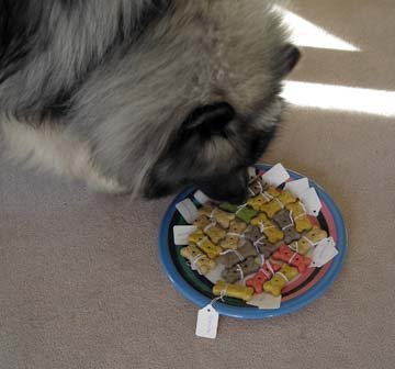 Back to “not choosing”. I decided to put all the entries into a lottery and let the Boyz decide. I have chosen a lottery in the past this way, with my previous dog Panda, and it is a total hoot. I wrote the names of all 23 entries (sadly I had to eliminate 2 for going over the 50 word limit) onto string tags, tied them to dog biscuits, put them on a plate and let the dogs choose 3 biscuits. Kit chose twice and Kanab chose once. (Kanab is the greedy and impetuous one and he dived in so hard it was all I could do to keep him from not taking 3 biscuits in his mouth at the same time!!) Kit, being ever so much more polite and dignified, waited there to be asked to take a biscuit, so I let him do it twice.