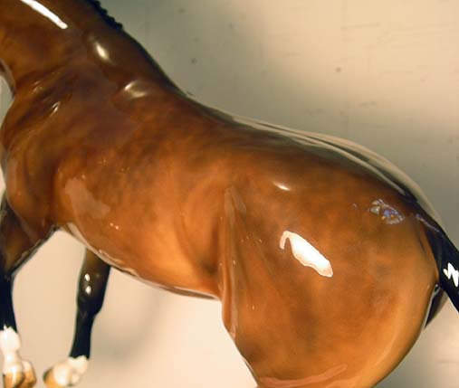 I’m going to attempt to “save” this Hagen-Renaker “Roan Lady”. It has a big glaze drip with air bubbles in the belly, and a very very flat painting job. Can this piece be saved and changed to an amazing new color instead? Stay tuned!