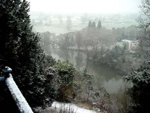 Later it began to snow for real, so I drove up to Cliveden. This famous estate is up on a hill overlooking the Thames so it had a little bit more snow. It was a great place to take photos of the snow. I walked all the way around the building and took a bunch of photos. And hit up the gift shop of course. (I’ve got to get out of this country, the gift shops are going to kill our finances!!!) Here are photos of their garden, the Thames, and their ornate gilt clock tower.
