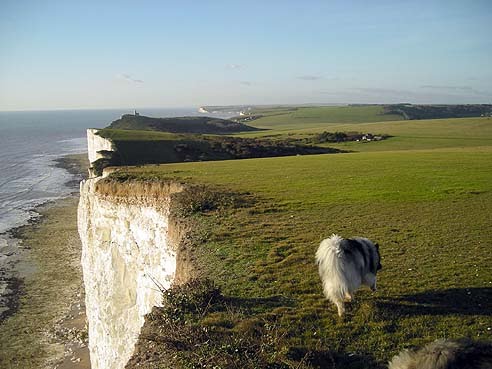 These photos are not of the famous White Cliffs of Dover. This is actually a place called Beachy Head, near the pretty seaside town Eastbourne, east of Brighton. (Another place on the List, not yet gotten-to.) I can’t tell you how beautiful this piece of coast is. And we had it practically to ourselves because it was a winter weekday. It is just crazy the way the green grass is mowed, right up to the edge of the cliffs, no fence or anything! In fact I kept the Boyz on the leash until we got to the edge because I had this horror of them not realizing it was a cliff and just bounding right over! It is surprising that there aren’t fences and warning signs, because Britain definitely is a nanny-state kind of place with excessive handholding and admonishments for about everything. (And I thought the USA was bad for that sort of thing!) It is also amazing that this area isn’t in private hands after all the centuries.