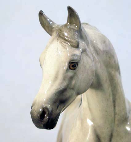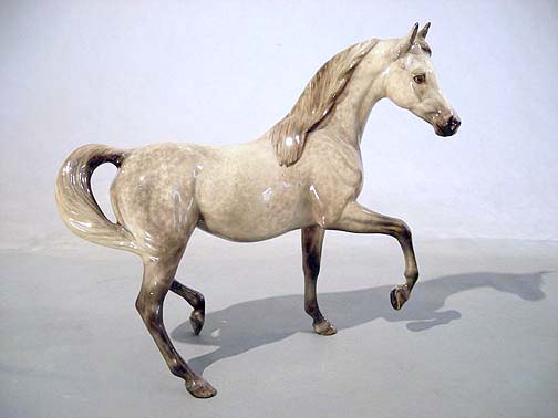 I can also custom-overglaze an existing glazed china piece from mass-producer potteries like Hagen-Renaker. You can order one of their current re-issue horses in the white-grey color and then I can fire just about any gorgeous custom color into the glaze. I have a few of these myself that I am eager to glaze when I get back. PLEASE talk to me first BEFORE you order one of these from H-R. Here’s a fleabit grey “Sheba” I glazed: