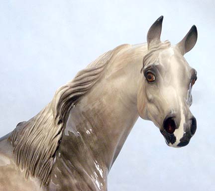 This is an earthenware china “Optime” Arabian Stallion in glossy finish, custom glazed by me. It is a flashy dappled grey with hints of rose in the coat. Seeing my work in earthenware has been quite a revelation: the detail in the castings is a lot better than what we would get in the bone china versions!! All the crisp details I had in the original sculpture are there, where they went sort of soft in the bone chinas. I can only conclude that earthenware holds the detail better! It is a delight to work with these now, though I still do love the color and “feel” of bone china.