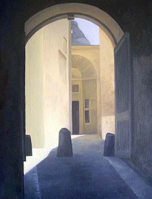 Here’s my first painting. It is from this photo that I took in the ancient walled city of Mdina on the island of Malta in the Mediterranean not too far from Sicily. We spent a week there last September. It’s not quite finished; I just need one more session to put in the street lamp and a few other small details.The point wasn’t just to exactly reproduce the photo. In fact I think the photo is amazing and like it better than the painting. But it has been interesting making the painting work as well. I am pleased with how even though everything is more simplified, the essence of the scene is the same.