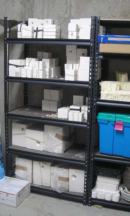 Here is a photo of all my ceramics molds, stored on their shelves in our new house. I hadn’t cast any new work in them since well before we moved last October, and there were a few cobwebs strung between them…!