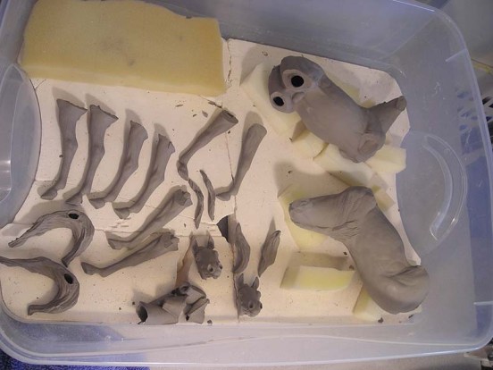And here are all the parts successfully pulled from the molds, which in the next day or two will be pieced together to become an Optime earthenware china horse. It will, if I don’t screw up the delicate process of sticking the pieces onto the body. They are very fragile and must remain damp!