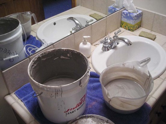 Here is my bucket of earthenware slip. It is essentially liquid mud plus some other chemical additives. I am trying to keep the bathroom attached to my studio fairly clean, but it is honestly way too “pretty” to be an art studio’s wet space. Fortunately I can do most of the messy cleanup in the bathtub next to it. But I fear someday when we sell this house, they’ll have to remodel this bath! The only thing I miss about my old house’s studio was the full kitchen with double steel sinks and formica counters.