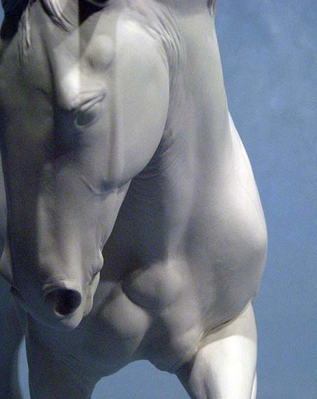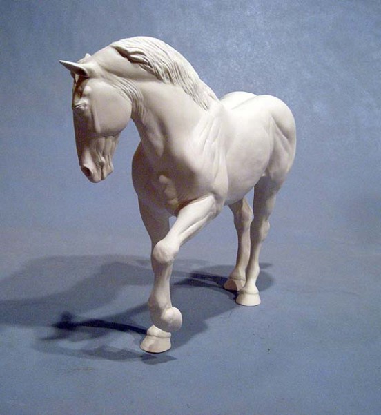 In my last blog entry I talked about casting my horse sculptures from their plaster ceramics molds, and having to piece them together. In the past month or so of molding work, I also decided to try and customize a Boreas Percheron in greenware. I succeeded in getting it all the way through the process and firing to bisque! The custom alterations are a raised foreleg and new tail. I am going to glaze this one to a very dark dappled Percheron grey. Here are a few photos. This is only my 2nd attempt at big reworks to greenware clay. It is not an easy process! Oh, and the two Optime Arabians I cast also survived the fire to bisque in perfect shape!