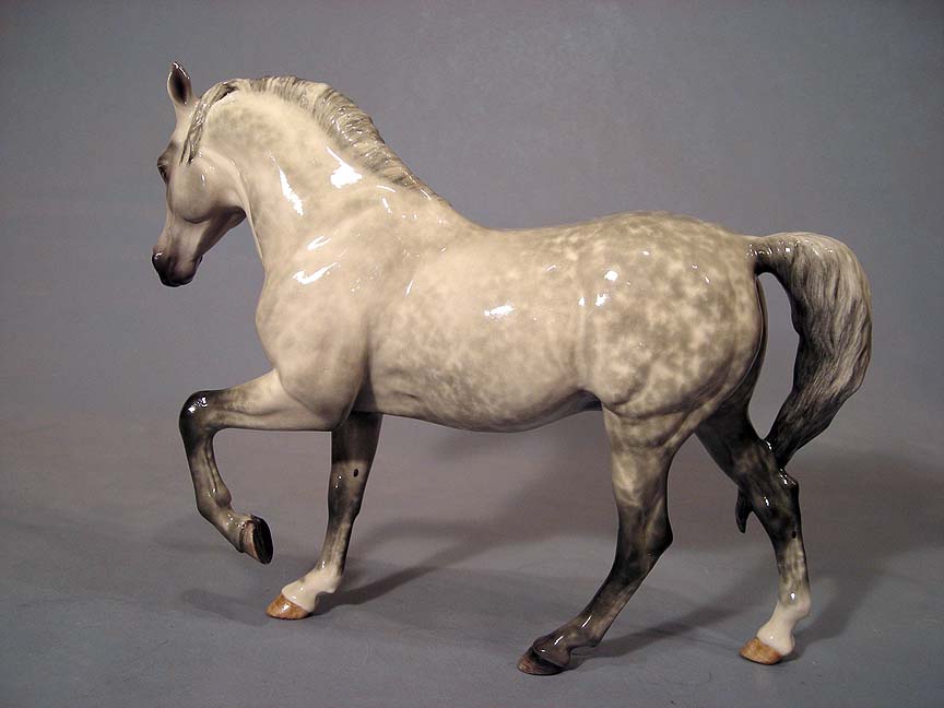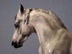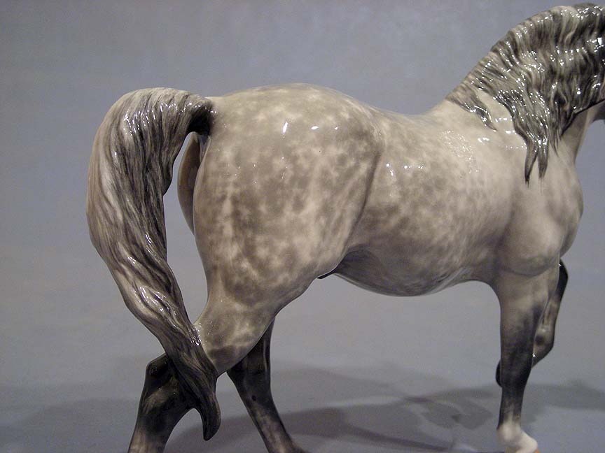 Each time I paint a dapple grey in overglazes I learn something new about how to control the amount and placement of color, and the glaze, and the air-eraser. All at the same time. This one represents my best work yet I think! His owner is Janelle Clemens of California, and I’ll be sorry to see him leave the studio.