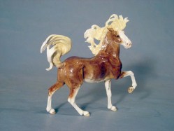 This first one is a chestnut sabino. I’ve textured the coat by hand with various paintbrushes, rather than the usual airbrushing. So there’s a lot of great sabino-y details in the coat and in the interface with the white areas. This piece is only 4″ tall!