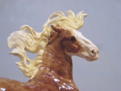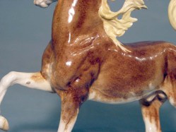 Now for the bad news. Partway through the glazing I broke off the raised front leg while cleaning the body prior to painting another layer of color. It was a clean break in the cannon just below the knee. Because it was a break in the white area and not on a weight-bearing leg, I continued with the glazing. As you can see from the photos, I have fully repaired and restored the break and you can’t see it.