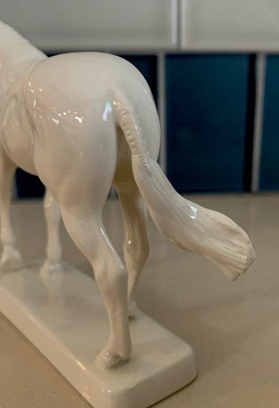 I am working on the test colors for the OF edition color right now. I want it to be an “easy”color that I can paint and fire in a maximum of 3 passes through the kiln. Hopefully two! Most likely: a dark shaded bay with interesting pangare areas, 4 white stockings, and the base left unpainted white gloss. All will be glossy finish.