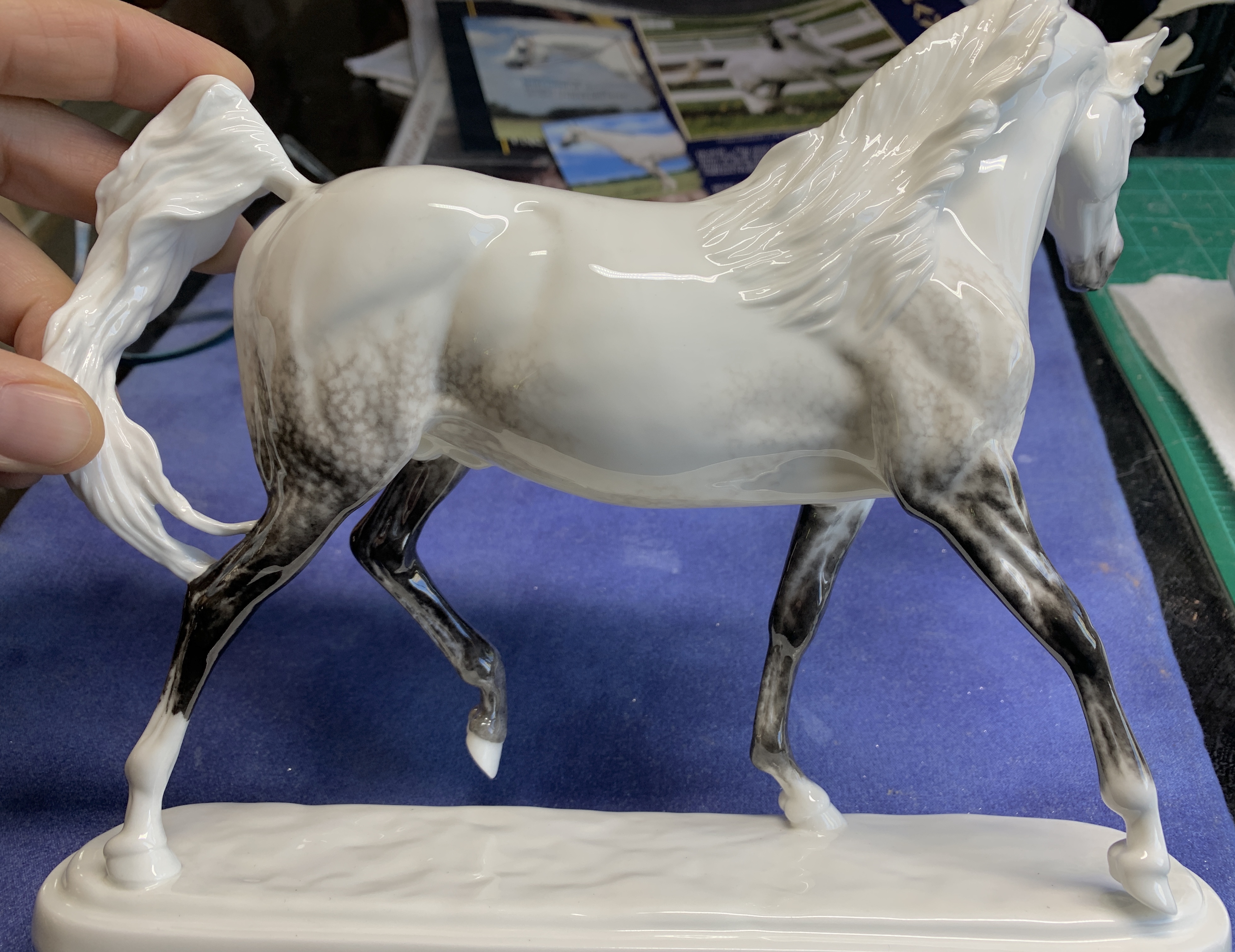 So, to compensate for the above, I’ve given it an absolutely splendid color. This is a very fine dappled grey, with the dappling painted in both cool and warm greys as they fade into the white body. I decided to leave a lot of the upper body, mane, and tail in the pure white of the china, so you can appreciate the gorgeous china itself. The base has been painted a bright spring green.